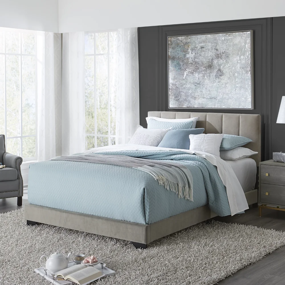 Set the stage for a plush retreat with the Reece upholstered bed by Hillsdale Living Essentials. Upholstered with soft-to-touch faux velvet fabric and graced with on-trend channel-stitched detail, the thickly padded headboard cradles you to sleep. The bed's clean lines and luxurious feel with be sure to transform your master or guest bedroom, and is easy to pair with traditional, transitional, glam, or contemporary styling. Requires the use of box spring and mattress, sold separately.