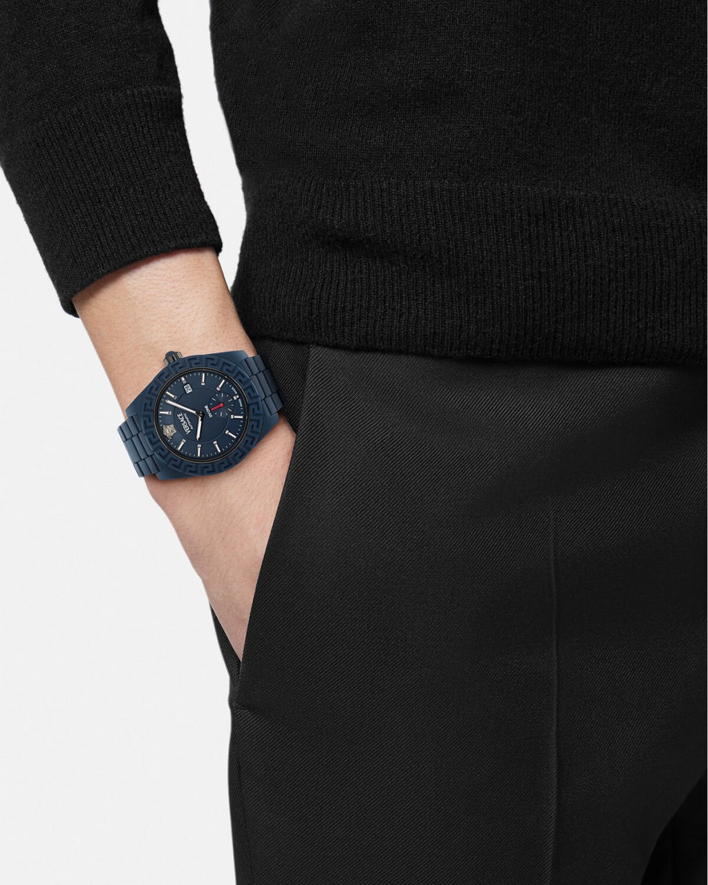This ceramic automatic watch is rich in details, with Greca on the bezel and Medusa at 12 o'clock. The dial is engraved with "DV One" and comes with a ceramic strap. All Versace watches carry the "Swiss Made" logo.